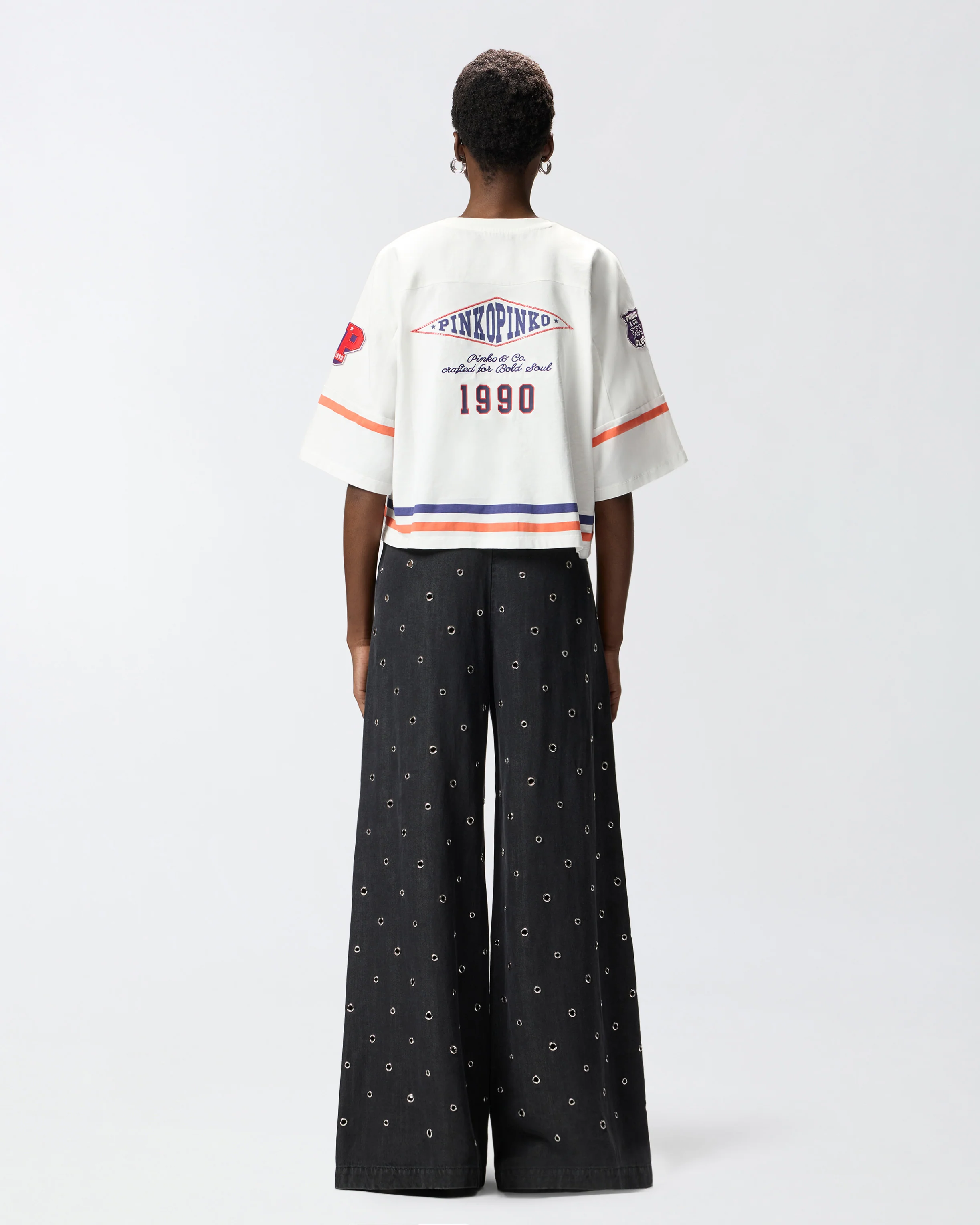 Slightly cropped V-neck T-shirt in cotton jersey, complete with twill band with contrasting stripes at the bottom of the garment and at the end of the elbow-length wide sleeves. The model offers a nod to the baseball kits of the '90s and is customised with numerous branded details, including a rubberised print flanked by raised thread embroideries and a sequin-embellished maxi PINKO Soul embroidery on the front, a shield on one sleeve and P-shaped patch on the other sleeve, embroidered lettering on the back and printsâalso on the backâwith sparkly touches for a shiny touch. - CANNOBIO T-SHIRT