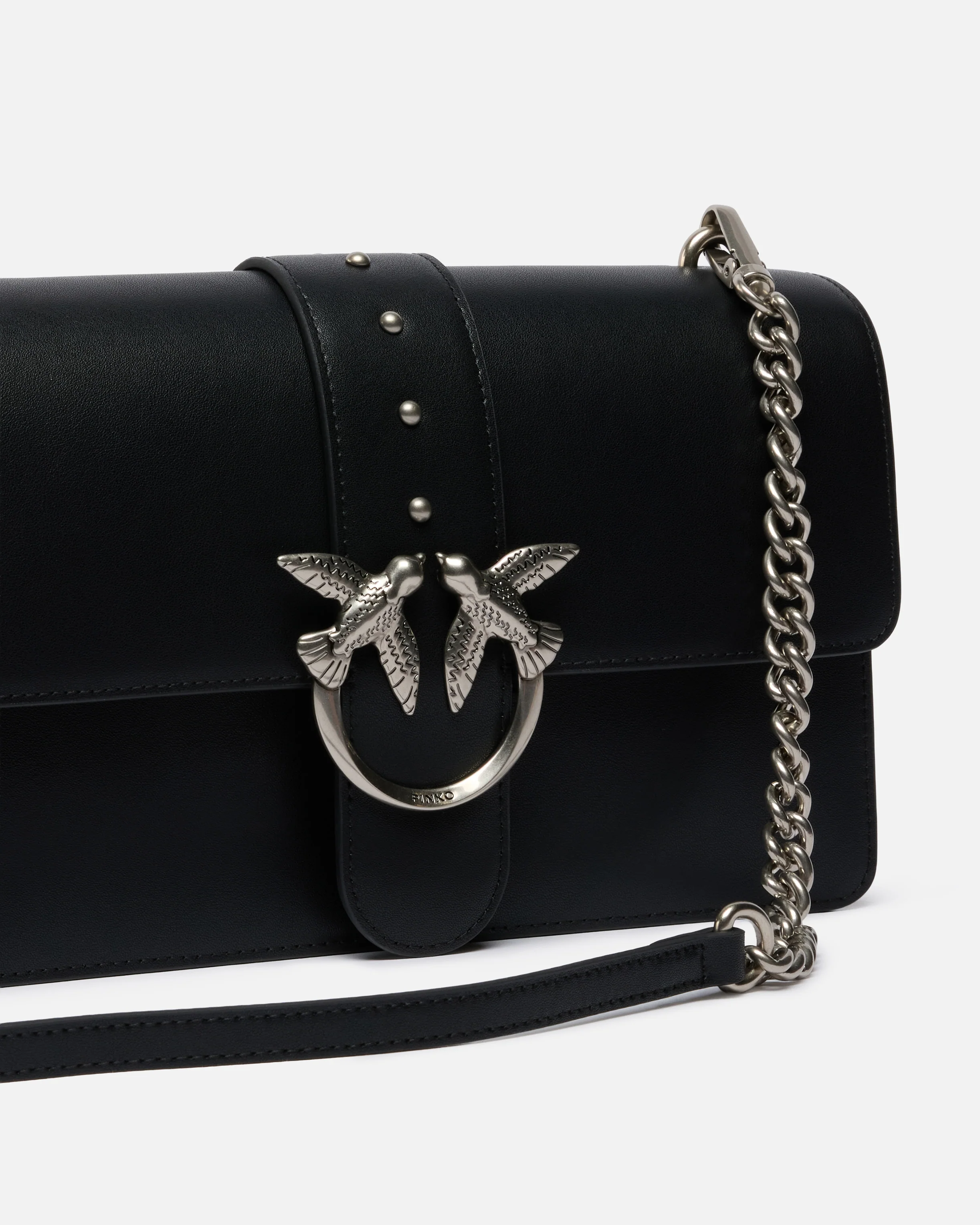 Love Bag One medium handbag in silky leather. Featuring an adjustable and removable leather and chain shoulder strap, this piece is very versatile and practical. The strap fastening with magnetic button is accompanied by a buckle with the Love Birds Diamond Cut logo and small metal studs. The cotton-lined interior features a zipped pocket to keep your essentials safe. Activate your PINKO bag: verify the authenticity of your product and access a personalised experience by scanning the Love Birds embroidery on the back of the bag with your smartphone! - LOVE ONE CLASSIC ST. CL